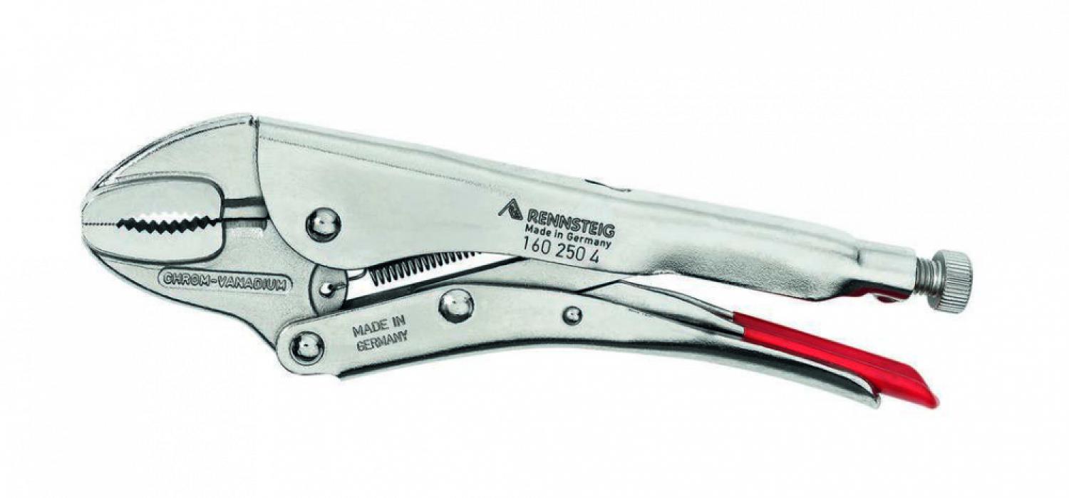 Зажимные клещи 180 мм, для зажима и фиксации деталей, регулировка диапазона зажима, запирание с помощью стопорного рычага, отпирание с помощью рычага разблокировки, никелированное покрытие. Сделано в Германии.